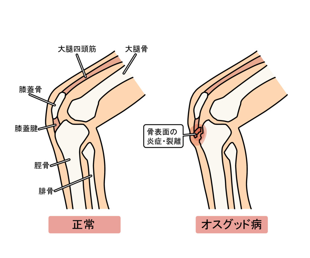 オスグッド病は、膝のお皿の下の骨(脛骨粗面)が引っ張られて炎症が起こる成長期特有の症状です。